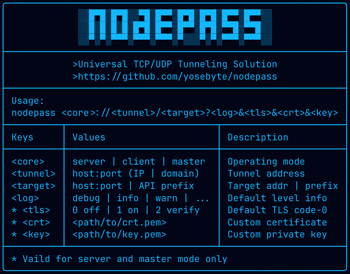 NodePass is an elegant, efficient TCP tunneling solution that creates secure communication bridges between network endpoints. By establishing an unencrypted TCP control channel, NodePass facilitates seamless data transfer through otherwise restricted network environments while offering configurable security options for the data channel. Its server-client architecture allows for flexible deployment scenarios, enabling access to services across firewalls, NATs, and other network barriers. With its intelligent connection pooling, minimal resource footprint, and straightforward command syntax, NodePass provides developers and system administrators with a powerful yet easy-to-use tool for solving complex networking challenges without compromising on security or performance.